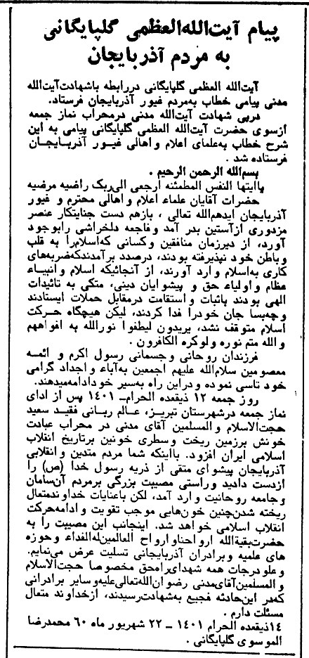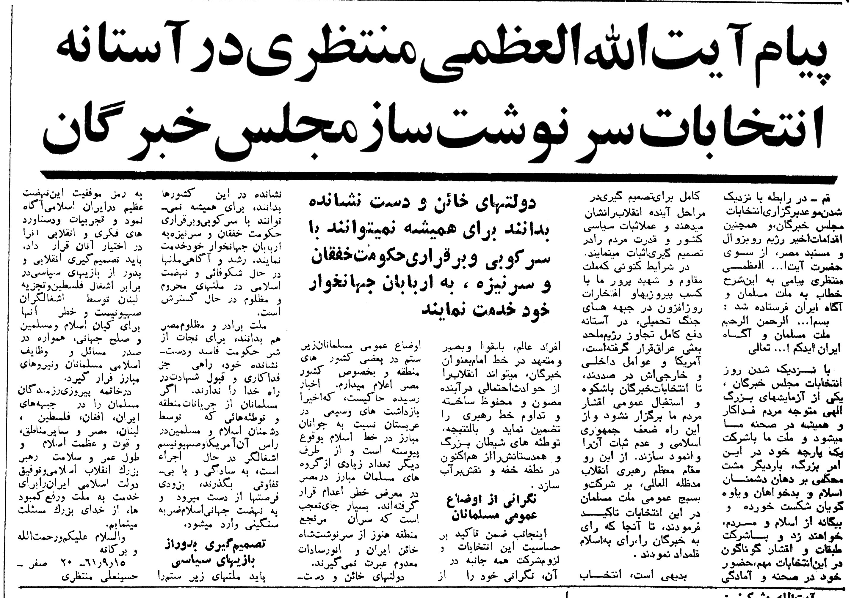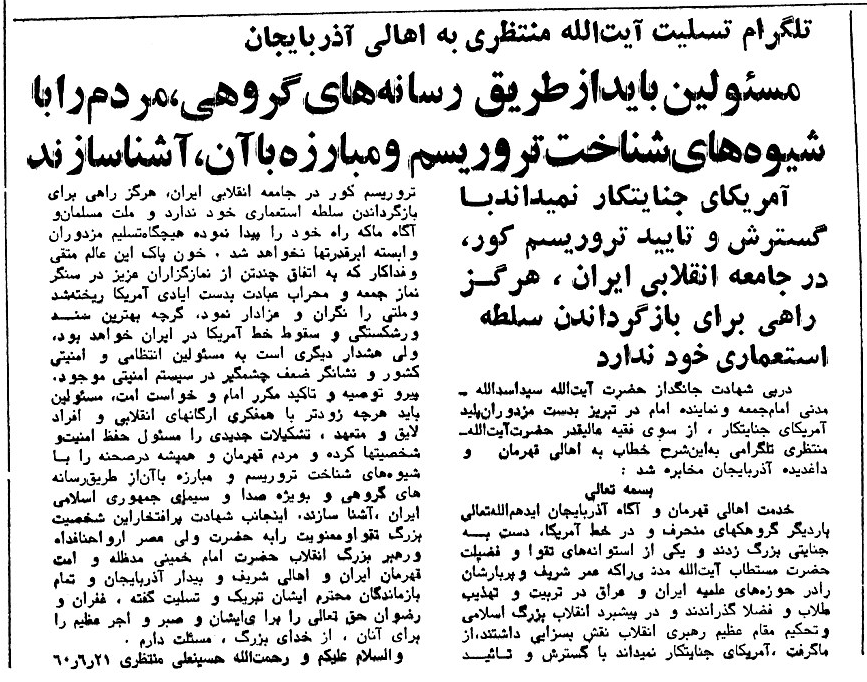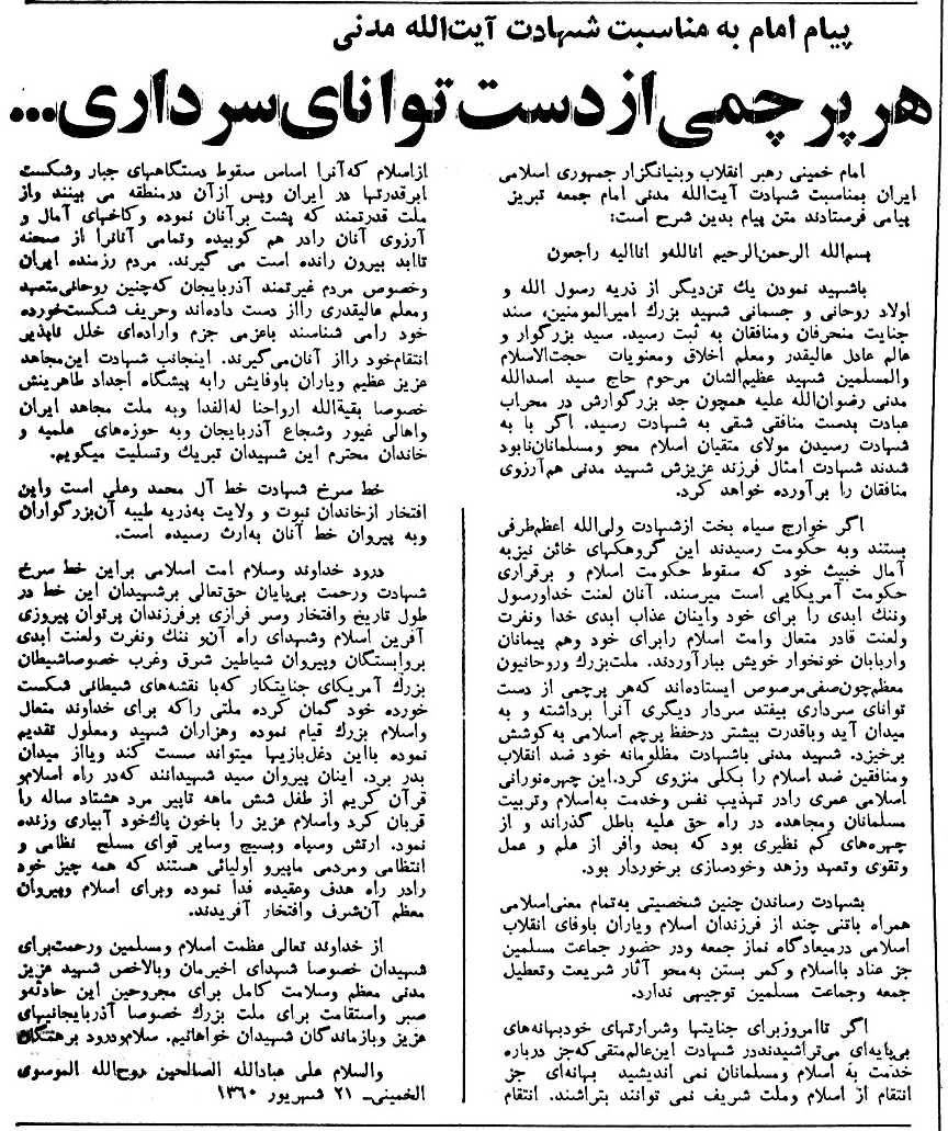 متن این پیام که از روزنامه اطلاعات 22 شهریور 1359 (صفحات 1 و 2) انتخاب شده است را به همراه تصویر سخنرانی اولین رئیس جمهوری اسلامی ایران مندرج در روزنامه انقلاب اسلامی 18 شهریور 1359 ذیلاً ملاحظه خواهید نمود:
