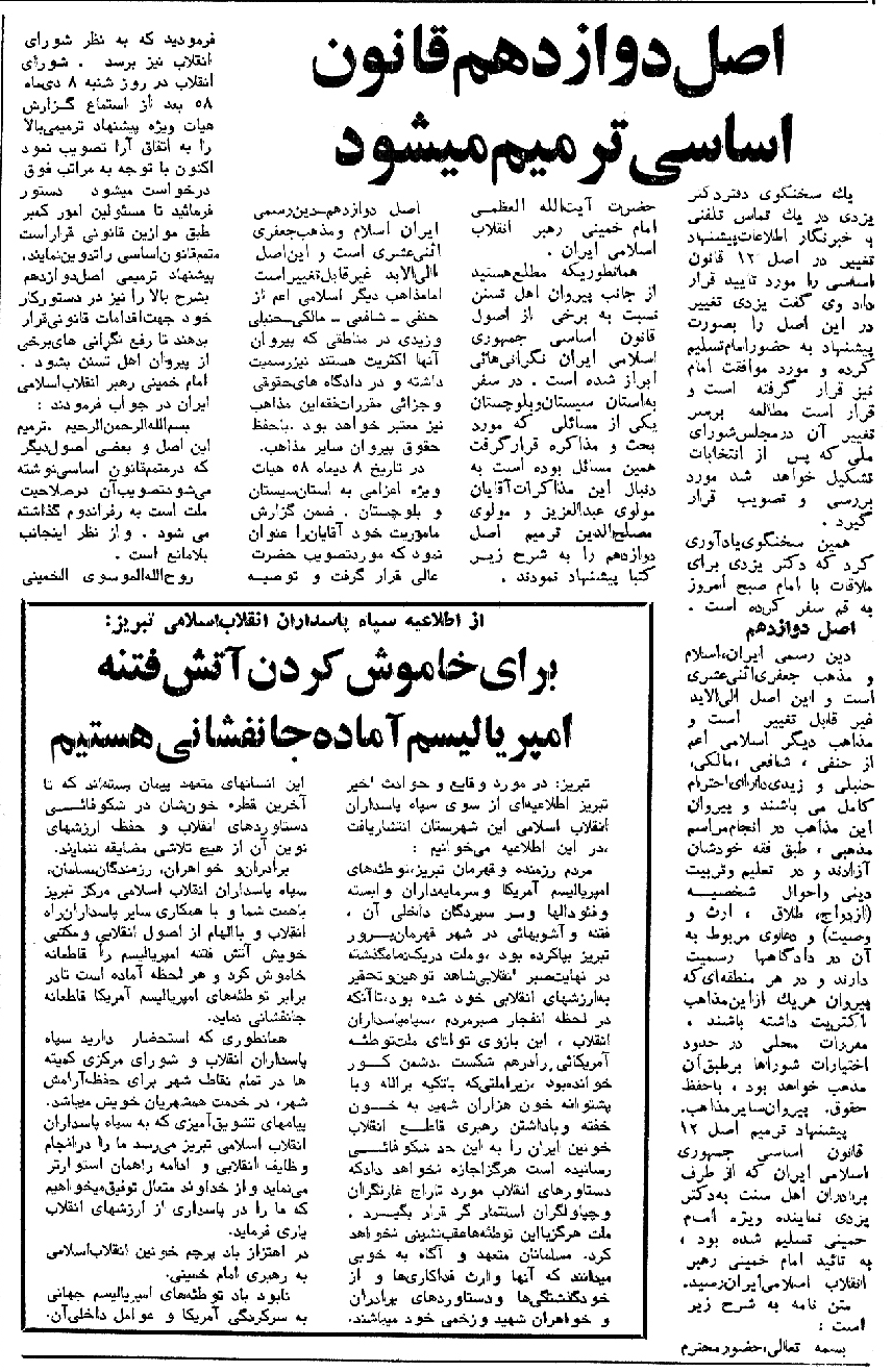 از جمله مسائلی که در سال اول انقلاب اسلامی ایران رخ داد تصویب قانون اساسی بود که در آذرماه سال 1358 به رفراندوم گذاشته شد لیکن برخی نسبت به اصول آن اعتراض داشتند از جمله اهل سنت در سیستان و بلوچستان و کردستان که به اصل دوازدهم آن که بیان می دارد: