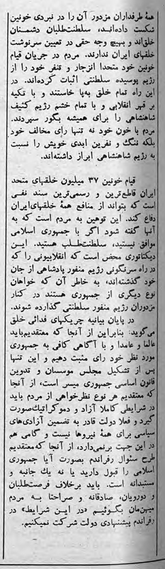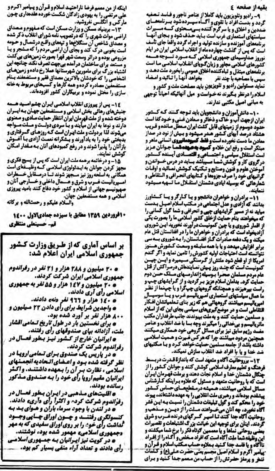 ــ امروز سکوت علمای بلاد و نویسندگان . گویندگان و تمام برادران و خواهران مسلمان در برابر جنایات صدام و سران خائن منطقه، تأیید جبهۀ کفرجهانی و از بزرگترین گناهان است.