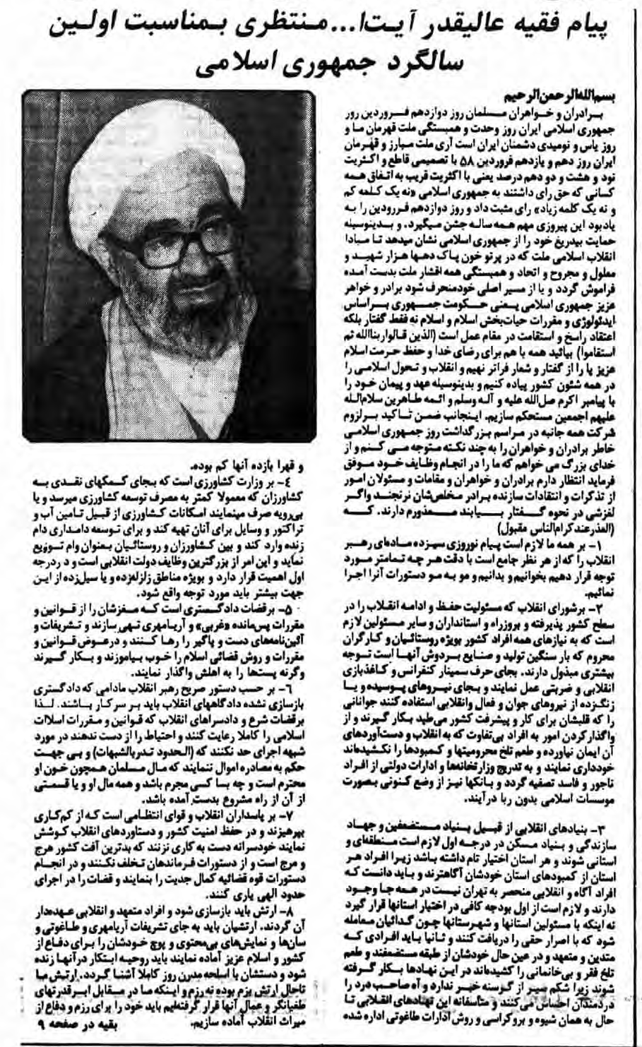 فقیه عالیقدر حضرت آیةالله العظمی منتظری (قدّس الله نفسه الزّکیّة) بمناسبت آخرین جمعه از ماه مبارک رمضان که روز جهانی قدس نام گرفت، طی پیام مهمی ملت مسلمان ایران و همۀ مسلمانان و مستضعفان را به شرکت در راهپیمایی عظیم دعوت و در این پیام بیان فرمودند: