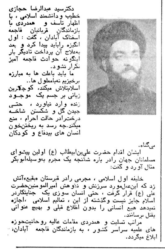 در پی جنایت عظیم آتش زدن سینما رکس آبادان که منجر به کشته شدن صدها فرد بیگناه گردید، دکتر سیّد عبدالرضّا حجازی خطیب و دانشمند اسلامی با اظهار تأسف و همدردی با بازماندگان قربانیان این فاجعۀ اسفناک گفت: