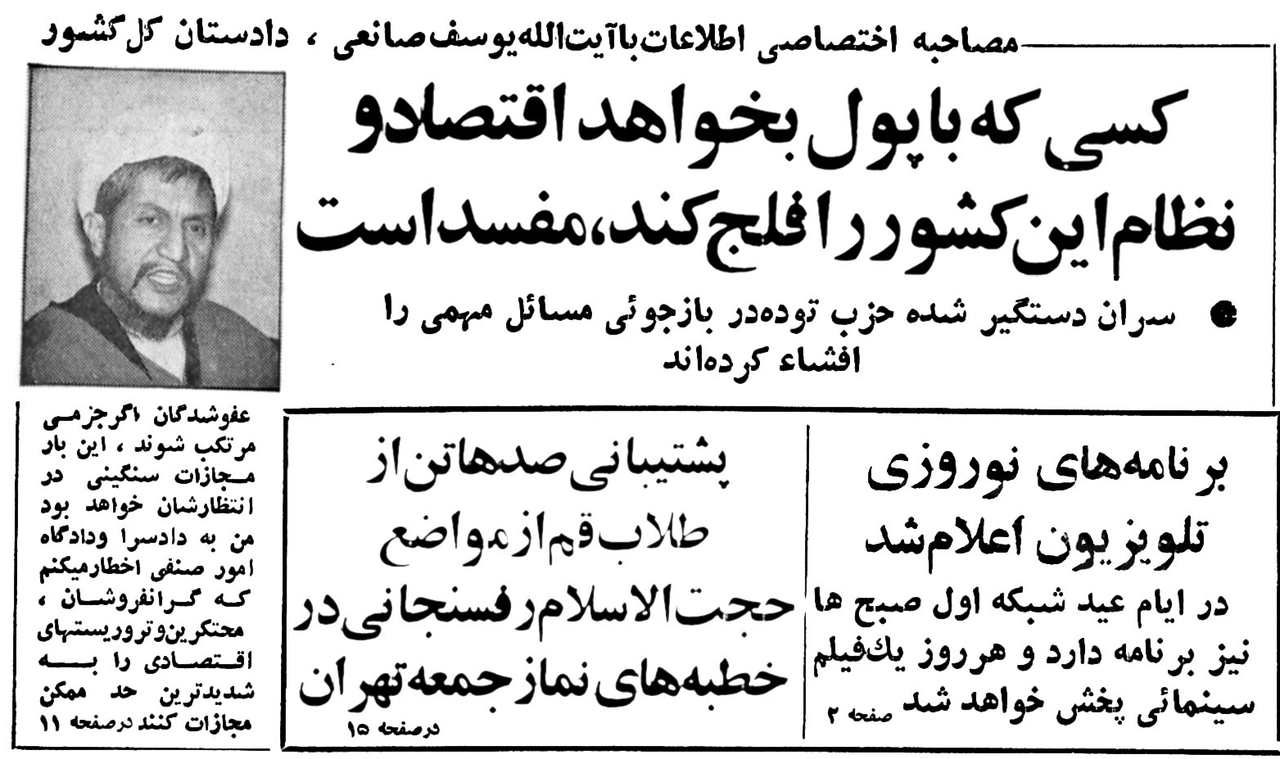 حضرت آیةالله العظمی صانعی رضوانالله تعالی علیه در مقام دادستان کلّ کشور طی مصاحبه ای با روزنامه اطلاعات در خصوص گرانفروشان و محتکرین، سران دستگیر شده حزب توده، شورایعالی قضائی، قاچاق کالا و ارز و .... مطالب مهمّی بیان کردند که ذیلاً ملاحظه مینمائید.