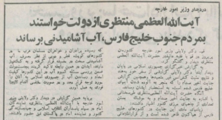فقیه عالیقدر حضرت آیةالله العظمی منتظری رضوان الله تعالی علیه در دیدار با آقای دکتر ولایتی وزیر وقت امورخارجه با توجه به جنایات رژیم سفّاک و بعثی صدام که منجر به آلوده شدن آبهای خلیجفارس شد، بیان داشتند: