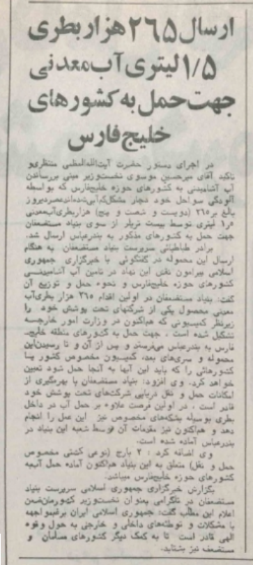 ذیلاً علاوه بر گزارش دیدار با فقیه عالیقدر، گزارش روزنامه اطلاعات مبنی بر ارسال ۲۶۵ هزار بطری ۱/۵ لیتری آبمعدنی از سوی بنیاد مستضعفان جهت توزیع در کشورهای مذکور را ملاحظه مینمائید.