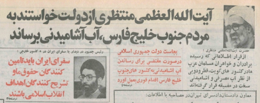 «از قرار اطلاعاتی که رسیده برادران و خواهران مسلمان عرب ما در کشورهای کویت، قطر و دوبی از نظر آب مصرفی و آشامیدنی سخت در مضیقه قرار گرفتهاند لذا بجاست دولت جمهوری اسلامی در صورت مقتضی برای رسانیدن آبآشامیدنی به کشورهای جنوب خلیجفارس اقدام فوری بعمل آورد.»