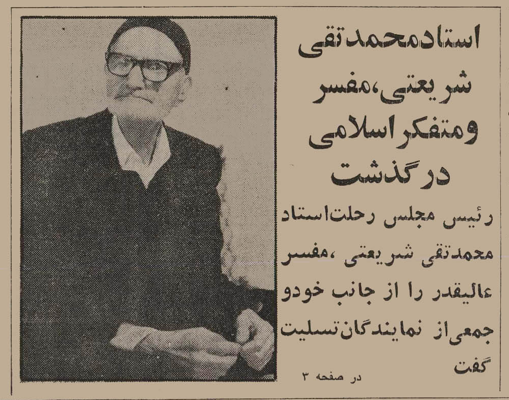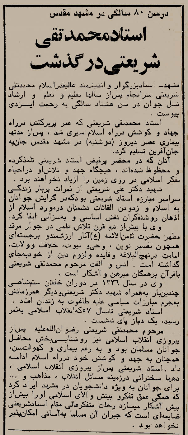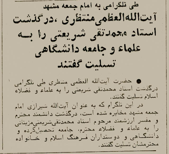 در پی درگذشت جانگداز مفسر ارزشمند قرآن کریم و نهج البلاغه، پدر بزرگوار شهید دکتر علی شریعتی مرحوم استاد محمد تقی شریعتی که در تاریخ 31 فروردین 1366 به دیار باقی شتافتند، فقیه عالیقدر حضرت آیت اللّه العظمی منتظری (قدّس الله نفسهما الزّکیّة) طی تلگرامی خطاب به امام جمعه محترم مشهد (مرحوم حضرت آیت الله شیخ ابوالحسن شیرازی) این ضایعۀ مؤلمه را بهعلما و جامعۀ دانشگاهی مشهد مقدّس تسلیت گفتند.