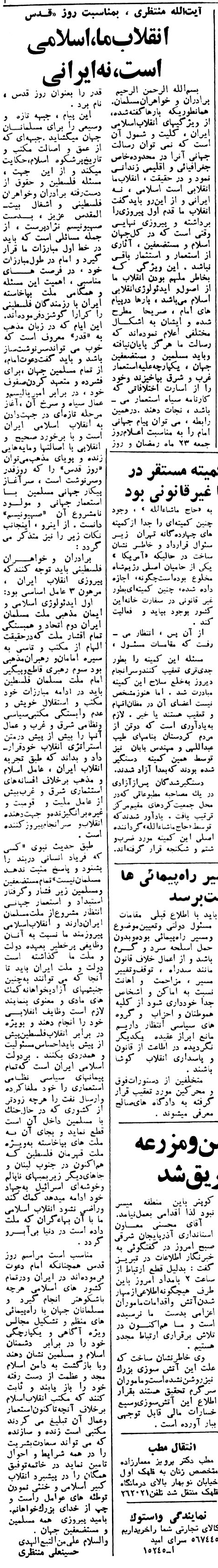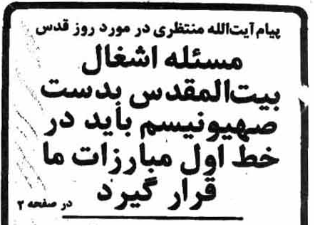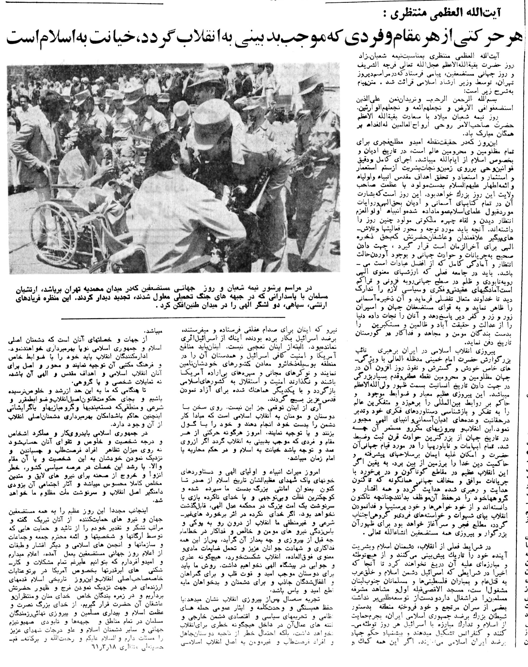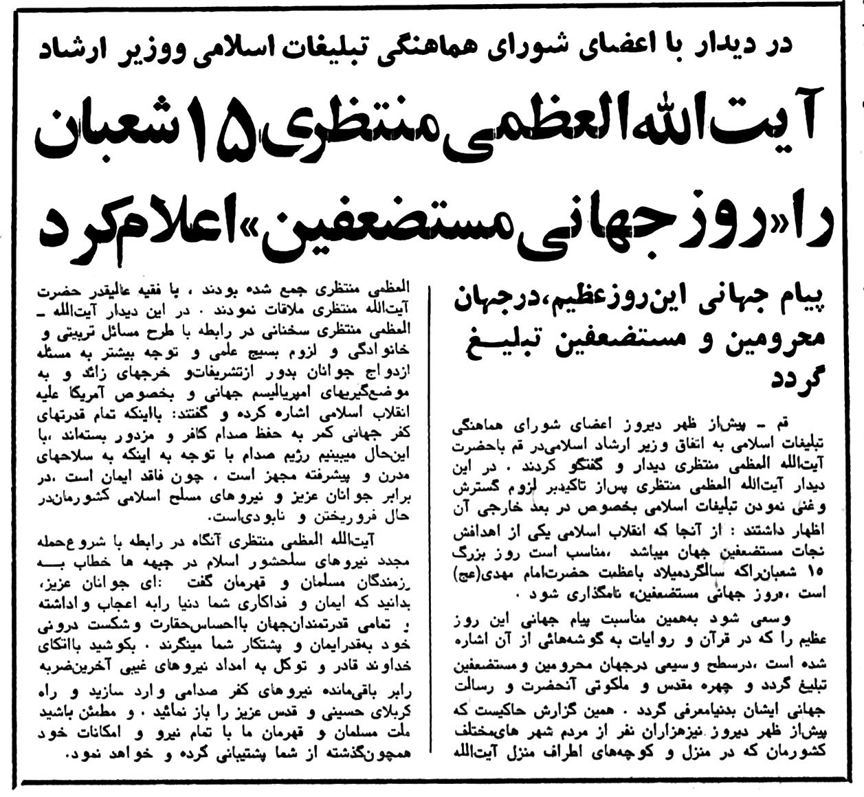 امام راحل و عظیمالشّأن انقلاب اسلامی، خمینی کبیر (قدّس سرّهالشّریف) به پیشنهاد فقیه عالیقدر حضرت آیةالله العظمی منتظری (رضوانالله تعالی علیه) عمل نموده و در مرداد ماه ۱۳۵۸ با دعوت از مسلمانان جهان برای زنده نگهداشتن آرمان فلسطین، آخرین جمعه ماه مبارک رمضان را به عنوان روز قدس نامگذاری کردند. در ۲۶ مرداد ماه اولین راهپیمایی «روز جهانی قدس» برگزار شد که در ادامه روایتی از این واقعۀ تاریخی تکرار نشدنی به نقل از روزنامه اطلاعات ۲۷ مرداد ۱۳۵۸ را ذیلاً مشاهده خواهید کرد.