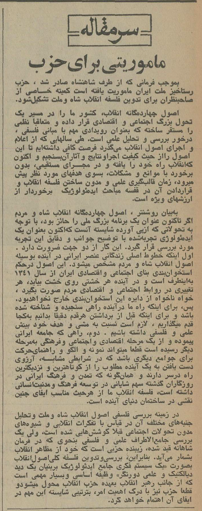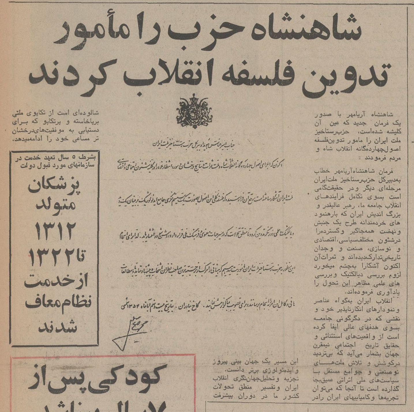 ذیلاً فرمان شاه و در ادامه سرمقاله روزنامه اطلاعات در این زمینه را ملاحظه می نمایید: