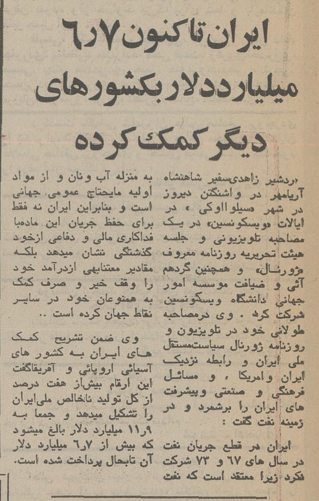 اردشیر زاهدی داماد شاه و سفیر وقت ایران در امریکا در یک مصاحبه تلویزیونی اعلام کرد ایران از ۱۱/۹ میلیارد دلار تا زمان مصاحبه وی ۶/۷ میلیارد دلار به کشورهای آسیایی، امریکایی و اروپائی کمک کرده است.
