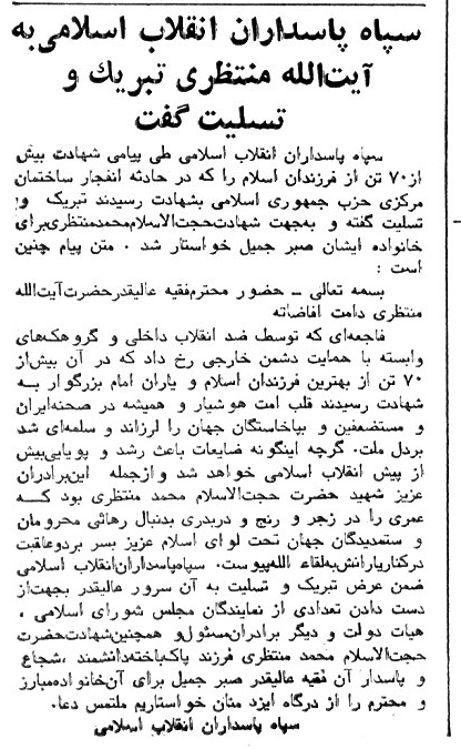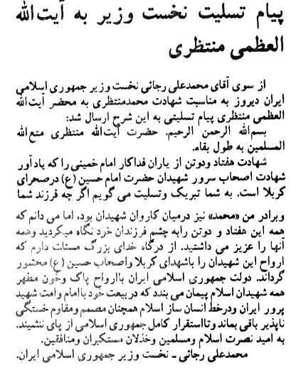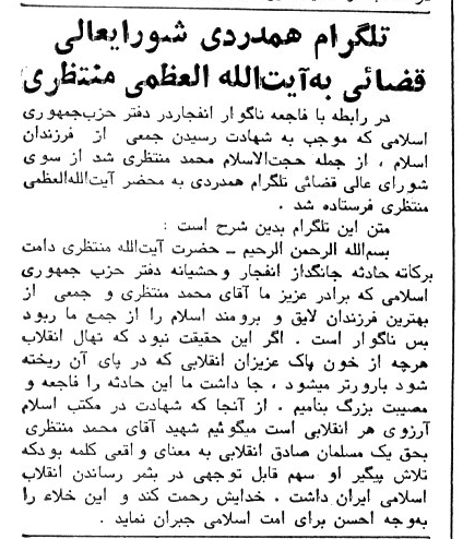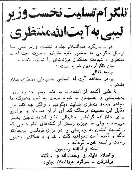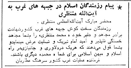 فقیه عالیقدر حضرت آیةالله العظمی منتظری (رشوانالله تعالی علیه) زمانی که رئیس مجلس خبرگان قانون اساسی بودند با صدور اطلاعیهای در تاریخ ۲۸ شهریورماه ۱۳۵۸ در خصوص فرزند شهیدشان حجّةالاسلام و المسلمین شیخ محمّد منتظری (رحمةالله علیه) قریب به این مضمون فرمودند: «وی به علت زندان و تحمّل شکنجههای طاقت فرسا و تحمّل آوارگی و دوری از وطن دچار تألّمات روحی شده و احتیاج به درمان دارد...» و این موضوع سبب شد مخالفان سوء استفاده کرده و تهمت بزنند که (خدای ناکرده) آیةالله منتظری گفته است فرزندشان دچار دیوانگی است؟! (که متأسفانه پس از گذشت سالها هنوز هم این اراجیف را تکرار می کنند) تا اینکه روزنامه اطلاعات در تاریخ ۱۱ دیماه ۱۳۵۸ طی مصاحبه ای با فقیه عالیقدر در این زمینه سؤال کرد و آن مرجع مظلوم به این تهمت اینچنین پاسخ دادند: