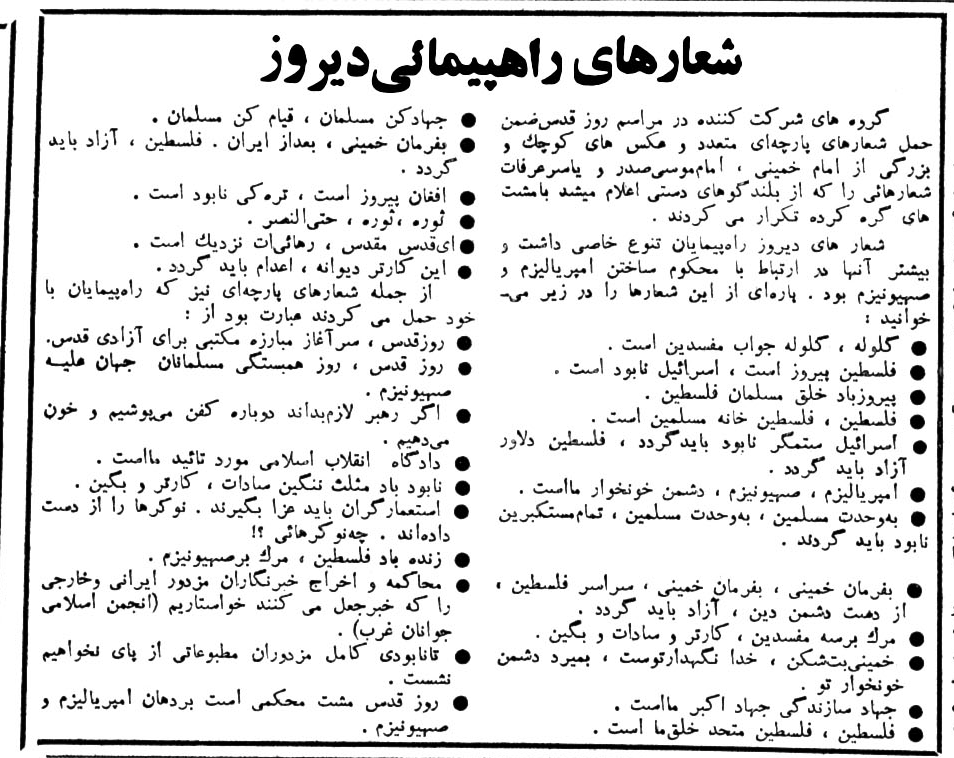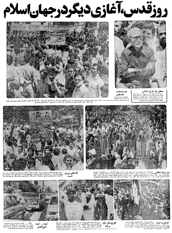 ــ روز قدس روز یادآوری کشتارهای بی رحمانۀ دیریاسین و تلّ زعتر و اردوگاههای صبرا و شتیلا است و ما چه زود این همه کشتارها و جنایات را فراموش می کنیم در صورتیکه نباید گذاشت خون این مظلومان که قربانی جنایات و سازش های سیاسی شرق و غرب شده اند پایمال شود و باید حماسۀ آنها را زنده نگاهداشت.