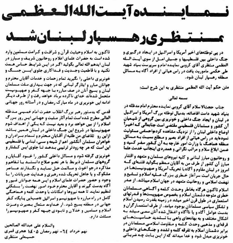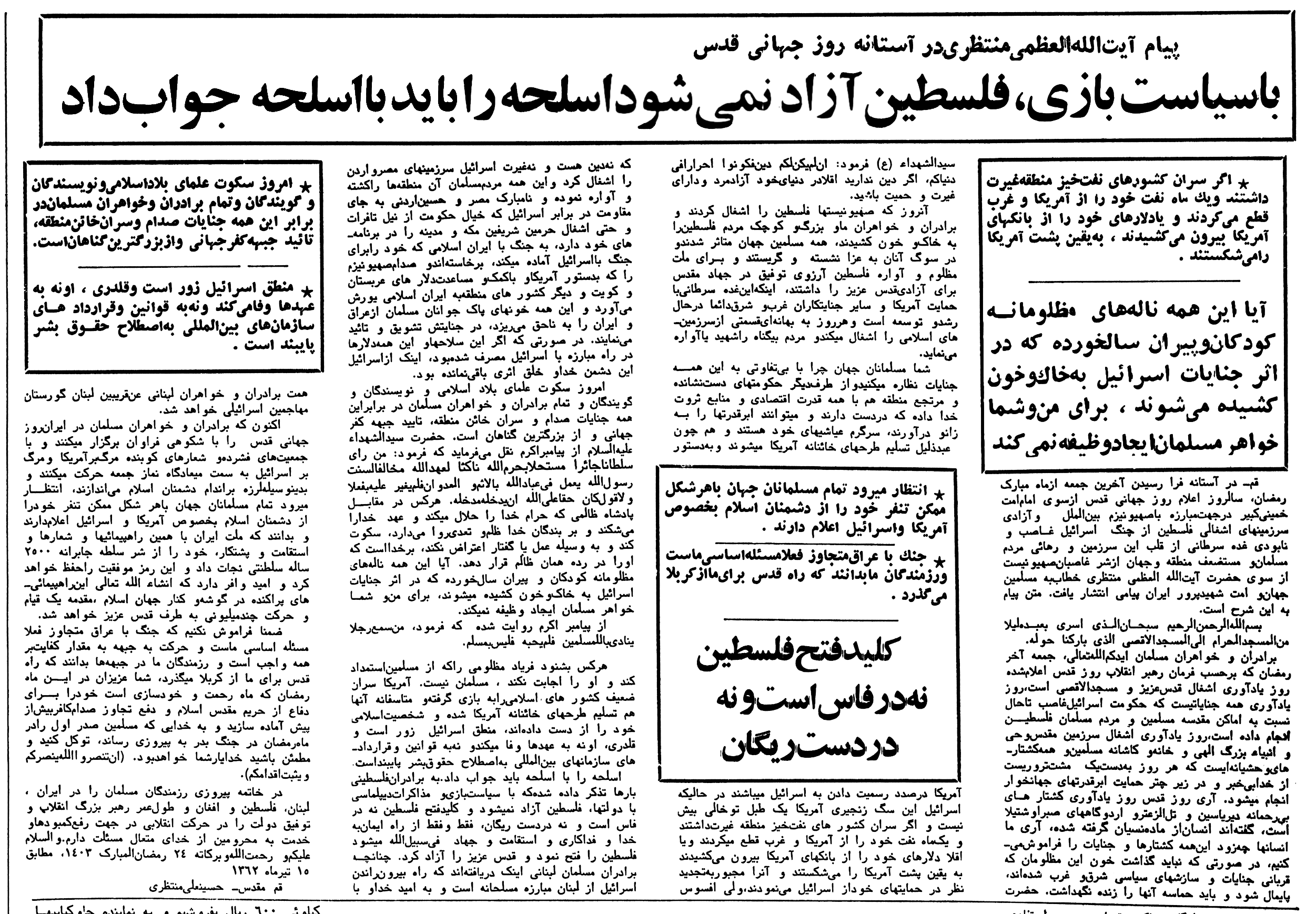فقیه عالیقدر حضرت آیةالله العظمی منتظری (قدّس الله نفسه الزّکیّة) بمناسبت آخرین جمعه از ماه مبارک رمضان که روز جهانی قدس نام گرفت، طی پیام مهمی ملت مسلمان ایران و همۀ مسلمانان و مستضعفان را به شرکت در راهپیمایی عظیم دعوت و در این پیام بیان فرمودند: